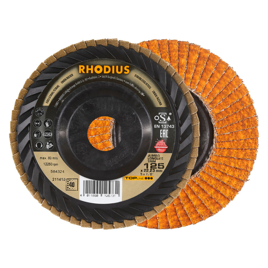 Omschrijving De Rhodius Jumbo Longlife Trim Ceramicon lamellenschijf 125 mm is ontwikkeld voor professionals die maximale levensduur en constante prestaties eisen bij intensief slijpwerk. Dankzij de toepassing van Ceramicon-technologie een mix van keramische en zirkoniumkorrels levert deze vlakke lamellenschijf een zeer hoge materiaalafname met langdurig scherpe korrels. Dit resulteert in sneller werken en minder schijfwissels. De schijf onderscheidt zich door extra lange, dicht overlappende lamellen, die zorgen voor een uitzonderlijk lange standtijd en een gelijkmatig slijpbeeld. Het unieke trim-systeem maakt het mogelijk om de drager terug te slijpen, zodat ongebruikte lamellen opnieuw benut worden maximale inzet tot de laatste korrel. Het vlakke ontwerp maakt deze 125 mm schijf bijzonder geschikt voor vlakslijpen en gecontroleerde materiaalafname, terwijl de speciale topcoating zorgt voor koeler slijpen en minder verkleuring op RVS.