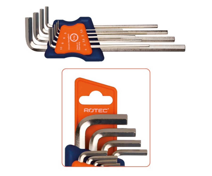 OmschrijvingEen Rotec inbusset met artikelnummer 03.880.4003 is een set vernikkelde, lange inbussleutels in metrische maten, geleverd in een compacte houder.
