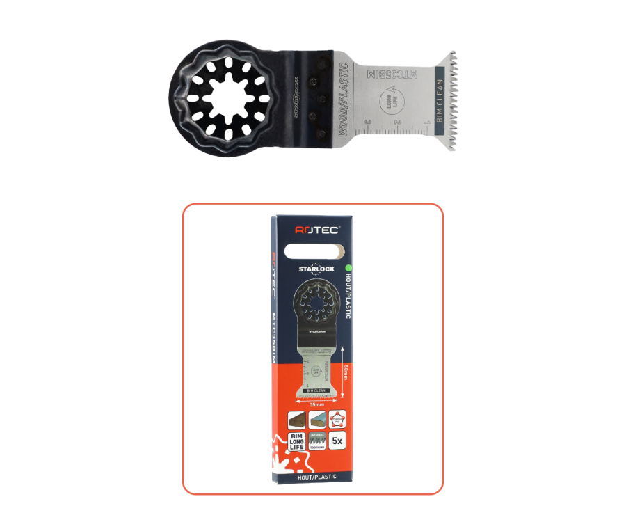 Omschrijving In hoogwaardig zaagwerk is niet alleen kracht bepalend, maar vooral de combinatie van precisie, duurzaamheid en materiaalbeheersing. Het Rotec Starlock Multitool Bi-metalen invalzaagblad MTCS35bi met Japanse vertanding is ontwikkeld voor vakmensen die foutloos willen invallen zagen in harde en gevoelige materialen met een afwerking die direct eindresultaatwaardig is. De MTCS35bi is een bi-metalen invalzaagblad met een fijne Japanse vertanding en Starlock-aansluiting. Deze combinatie zorgt voor een uitzonderlijk zuivere snede én een lange levensduur, zelfs bij intensief gebruik in harde materialen.