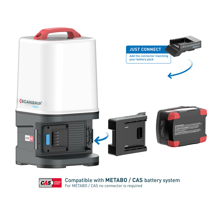Wat de Nova 2 Connect uniek maakt is dat deze compatible is met 18V accu's van veel toonaangevende merken elektrisch gereedschap zoals Metabo, Milwaukee, Dewalt en Makita. Hiervoor maakt het gebruik van de Scangrip Connector. Bovendien kan de Scangrip Power Supply worden gebruikt als directe stroomvoorziening waardoor werklicht continue beschikbaar is. De Area 10 Connect is een werklamp met een geïntegreerde back-up batterij die 50 extra minuten bij 1000 lumen garandeert.