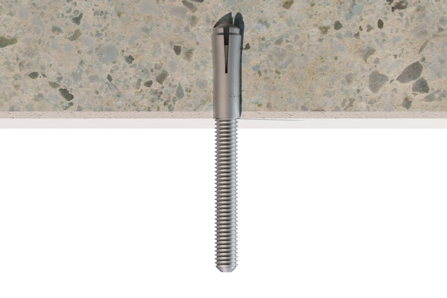 Verankeringstype: Mechanisch – Spreiding door inslaan Montage: Voorsteekmontage met slagpen Toepassing: Binnengebruik of droge omstandigheden Ondergrond: Beton, natuursteen Voordelen : Snel en eenvoudig te installeren Geschikt voor afneembare bevestigingen Compacte pluglengte – ideaal bij beperkte inbouwdiepte Hoge belastbaarheid in massieve ondergronden Toepassingsvoorbeeld Voor het ophangen van leidingen aan een betonnen plafond boort een installateur een gat van 10 mm, plaatst een HENO M8 slaganker en activeert het met een montagedop. Daarna draait hij een draadstang in voor bevestiging van een beugel. Resultaat: een snelle, stevige en herbruikbare verankering.