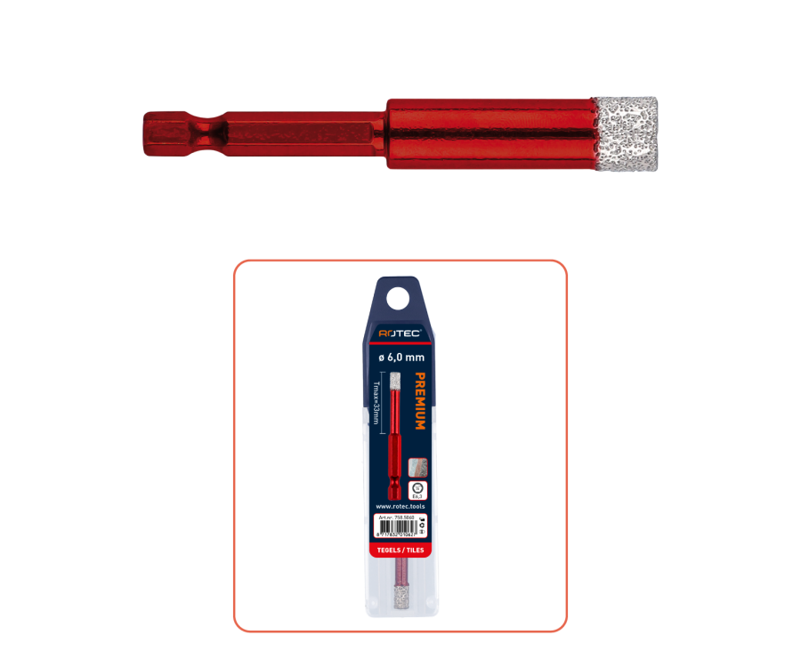 Omschrijving De Rotec Premium tegelboren met wax bieden ongeëvenaarde prestaties bij het boren in graniet, keramiek en dubbelgebakken tegels. Dankzij de vacuum-gesoldeerde diamanttechnologie boor je met hogere snelheden en geniet je van langere standtijden. De boren zijn gevuld met parafine, wat zorgt voor optimale koeling en efficiënte slijpselbinding tijdens het boren. Ze zijn speciaal ontworpen voor gebruik op alle accu-boormachines, op het hoogste toerental en zonder klopstand. Door regelmatig koelen, eventueel met water, verleng je de levensduur van de boor. Perfect geboorde, zuivere gaten zonder materiaalversplintering.