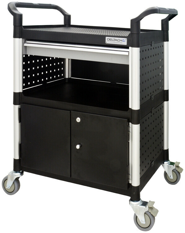 Omschrijving De Deltach werkplaatstrolley 511200 is een robuuste en veelzijdige mobiele werkplek, ideaal voor gebruik in professionele omgevingen zoals werkplaatsen, garages en serviceafdelingen. De combinatie van een ruime lade en afsluitbare locker biedt zowel directe toegang als veilige opslag voor gereedschap, onderdelen en persoonlijke items. Stalen constructie met poedercoating slijtvast en bestand tegen dagelijks intensief gebruik 1 ruime lade op kogellagers voor soepel en geruisloos openen Afsluitbare locker voor veilige opslag van gereedschap of waardevolle materialen Werkblad met opstaande rand voorkomt afrollen van onderdelen 4 PU zwenkwielen waarvan 2 met rem voor mobiliteit en stabiliteit op de werkvloer Ergonomische duwbeugel voor comfortabel verplaatsen