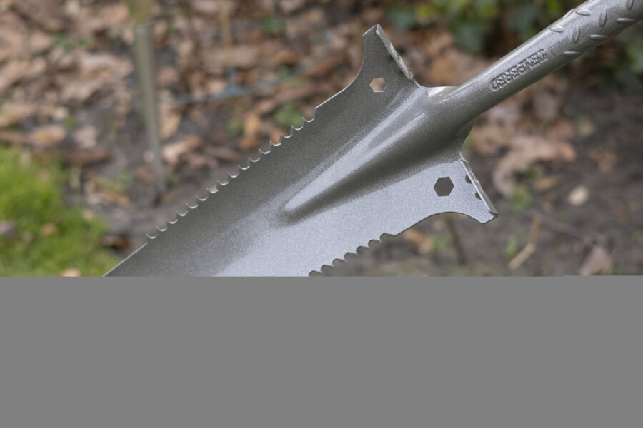 In tegenstelling tot een normale spade, beschikt de boomwortelspade over een zaagstructuur aan de zijkanten van het werkblad en een snijgedeelte aan het uiteinde.
