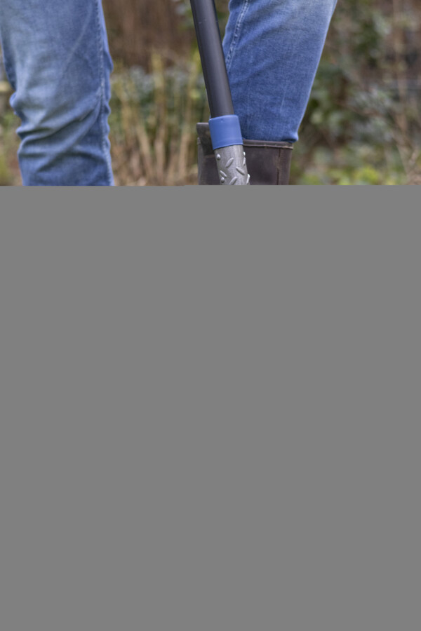 Met het opstapje genereer je nog meer druk in de grond, waardoor je vrijwel probleemloos de wortels van struiken en planten doorzaagt.