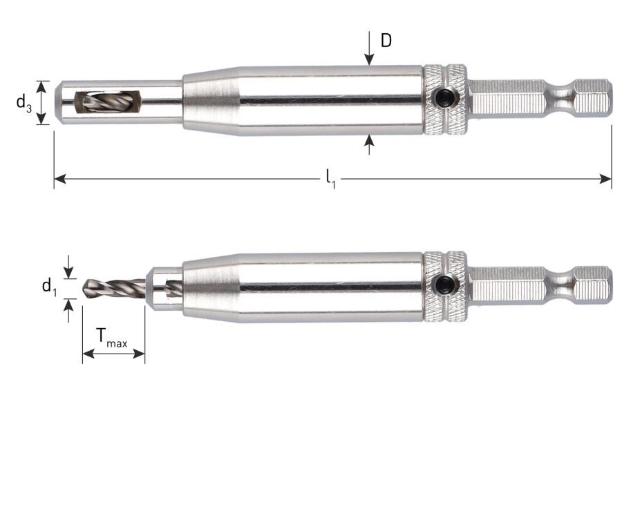 Uitvoering Zelfcentrerende scharnierboor met E6.3 bitopname voor het gebruik in (accu-)boormachines.